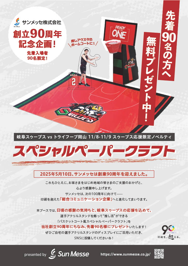 マッチデイパートナーであるサンメッセ株式会社様の創立90周年を記念し、各日先着90名様に「スペシャルペーパークラフト」をプレゼント!