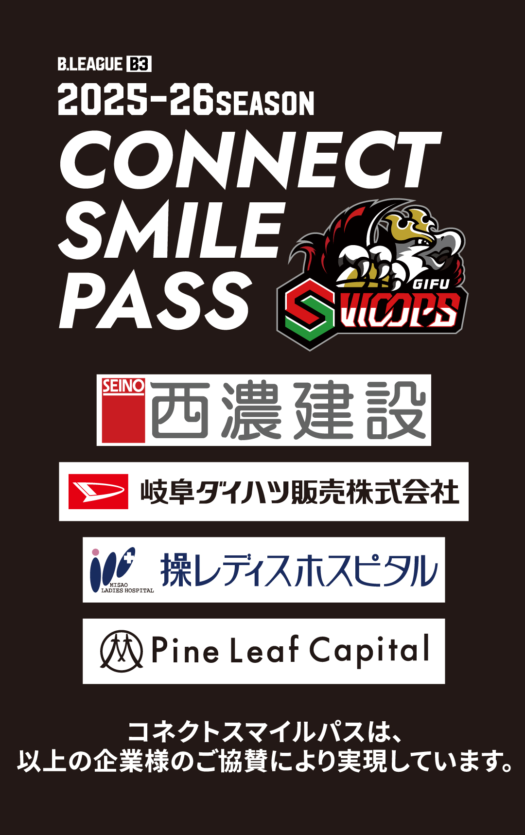 「コネクトスマイルパス」は、岐阜県バスケットボール協会様のご協力のもと、岐阜スゥープスのパートナー企業である「西濃建設株式会社」様、「岐阜ダイハツ販売株式会社」様、「操レディスホスピタル」様、「株式会社Pine Leaf Capital」様のご協賛により実現しております。