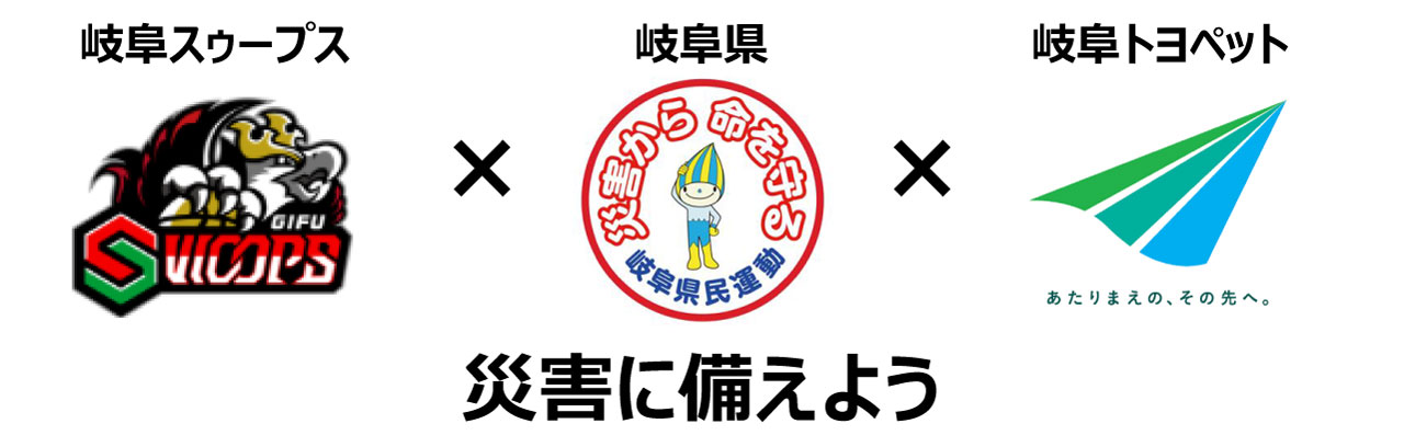3者が協力し、防災の意識を高める取り組みを岐阜スゥープスのアリーナ外、屋外イベントエリアで実施いたします。
