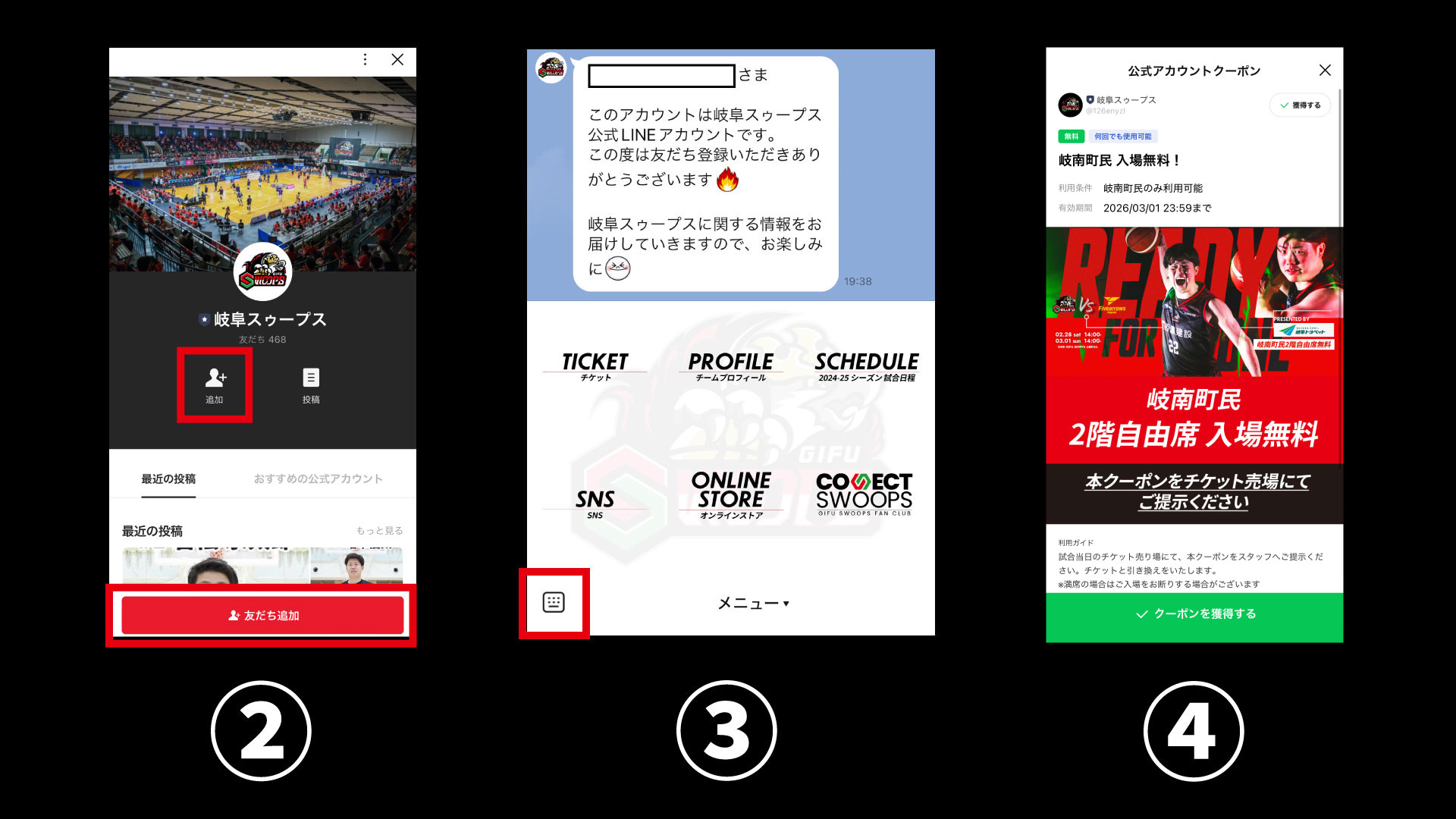 ①LINE内で「岐阜スゥープス」を検索、または「https://lin.ee/1iU3mX7」を検索し、岐阜スゥープスLINE公式アカウントを友だち追加
