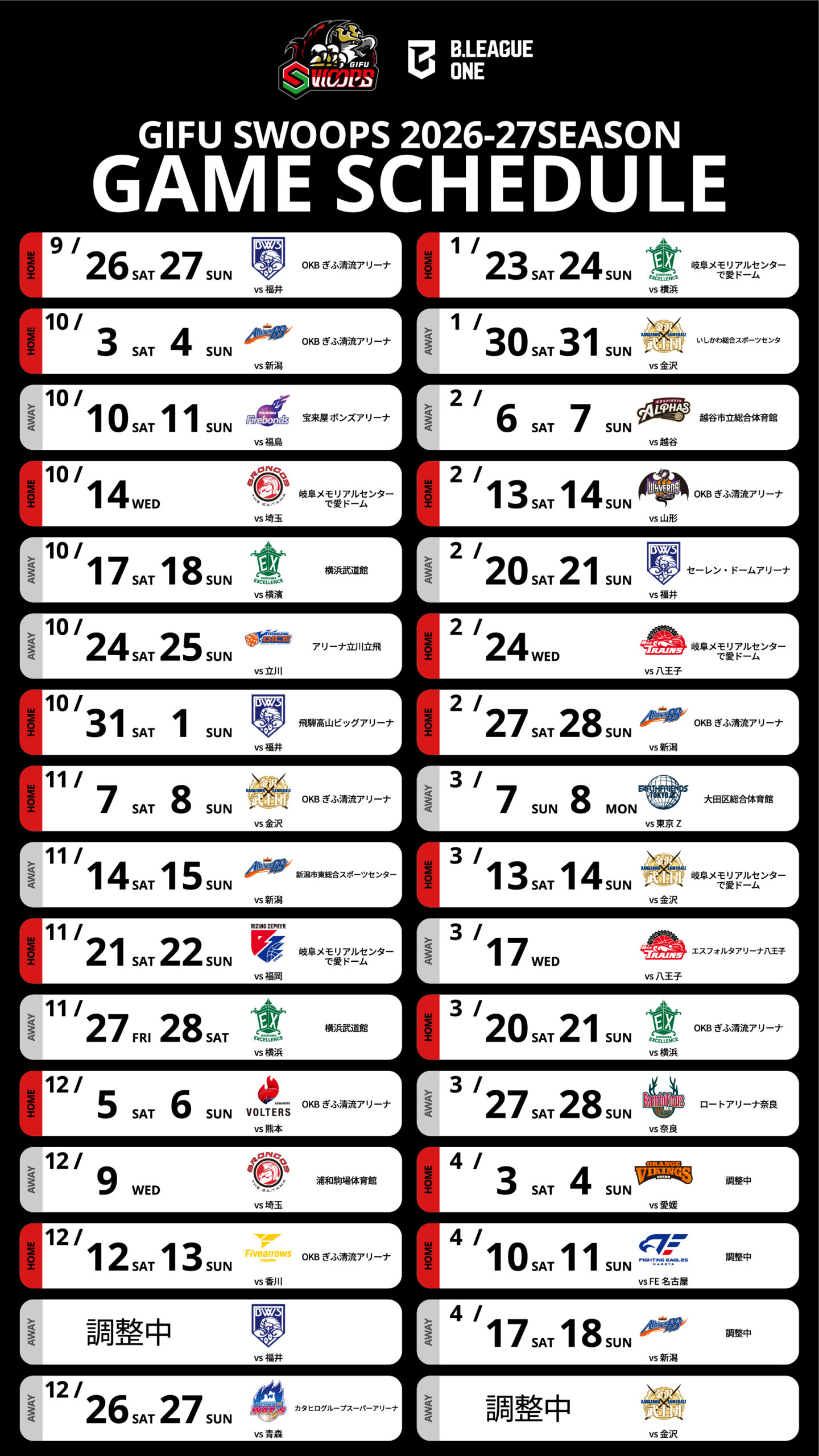 このたび、りそなグループ B.LEAGUE 2026-27シーズン「B.LEAGUE ONE」リーグ戦のスケジュールが決定いたしましたので、お知らせいたします。