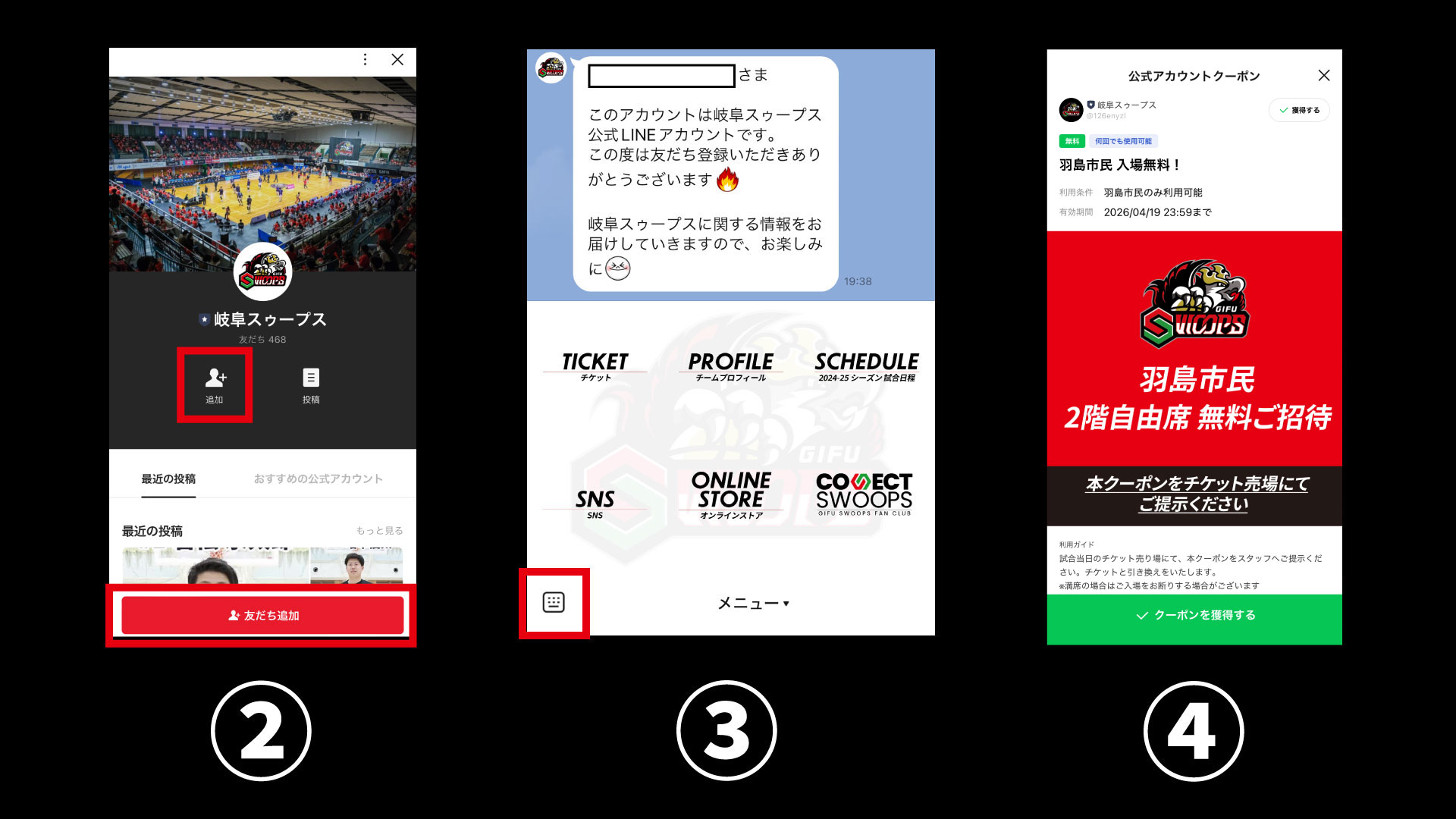 ①LINE内で「岐阜スゥープス」を検索、または「https://lin.ee/1iU3mX7」を検索し、岐阜スゥープスLINE公式アカウントを友だち追加